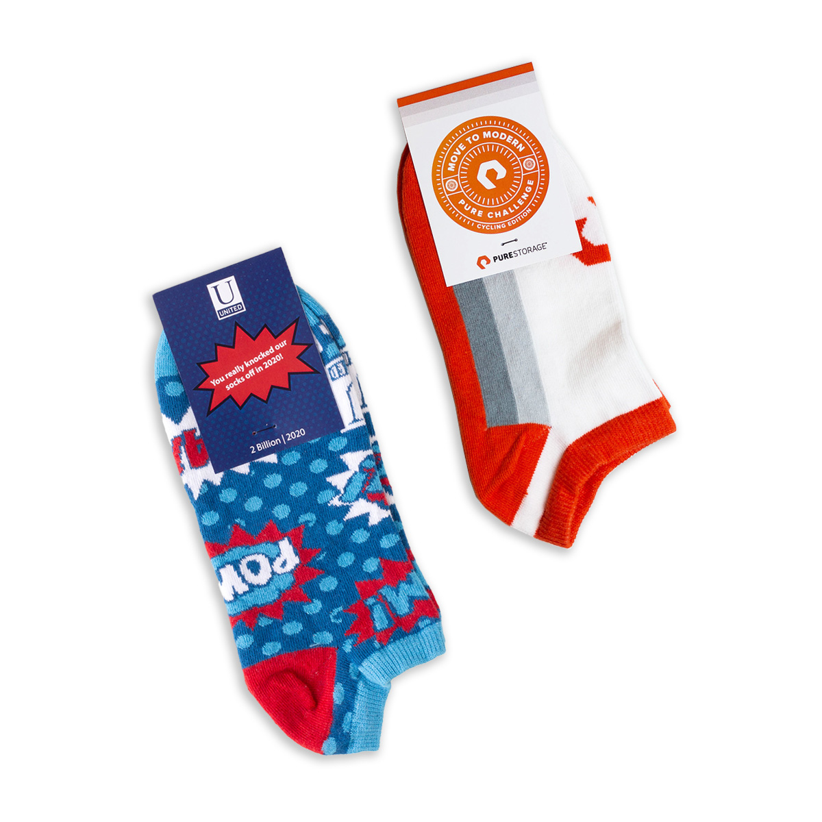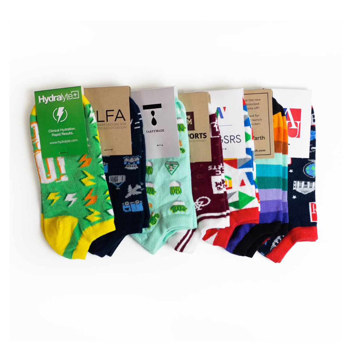 Custom Ankle Socks offer a sleek, low-profile look with premium comfort and branding appeal. Made in the USA from 75% US-grown cotton, 21% nylon, and 4% spandex, these socks feature a slim-fit cuff for a nearly no-show appearance. Knitted designs are woven directly into the fabric for vibrant color that won’t fade, peel, or crack. One size fits most (shoe sizes 6-12). Pricing includes custom woven socks and a full-color printed header card for added brand impact.